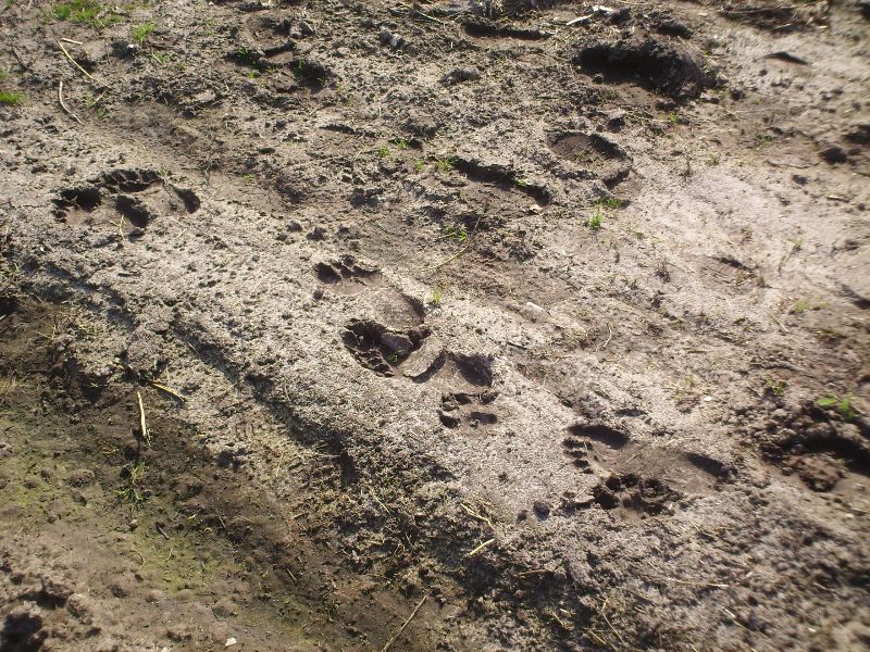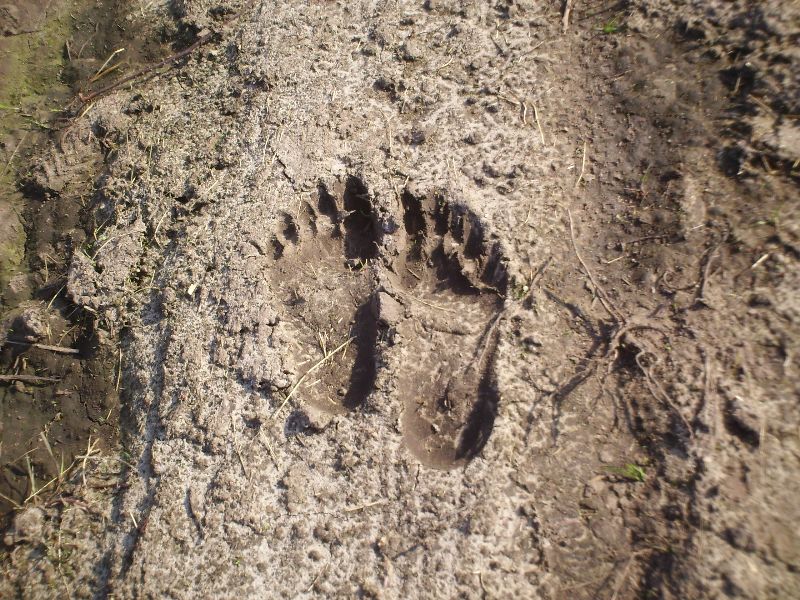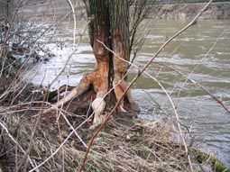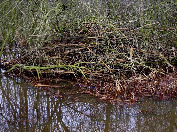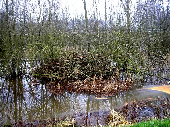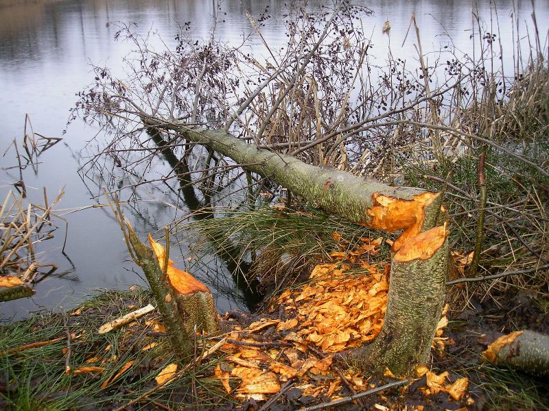 Twee flinke bomen, doorsnee van wel 40 en 30 cm. zijn al geveld en liggen deels in de stroom. Van deze bomen is vrijwel alle schors verdwenen, als voedsel en/of bouwmateriaal. Her en der in het bosje zijn ook al kleinere bomen om die wellicht voor bouw van een toekomstige dam of burcht moeten gaan dienen. Mogelijk is ook dat ze onder de grond in een hol wonen; op sommige plekken is het looppad ondergraven, waardoor er gaten in het looppad zijn ontstaan.