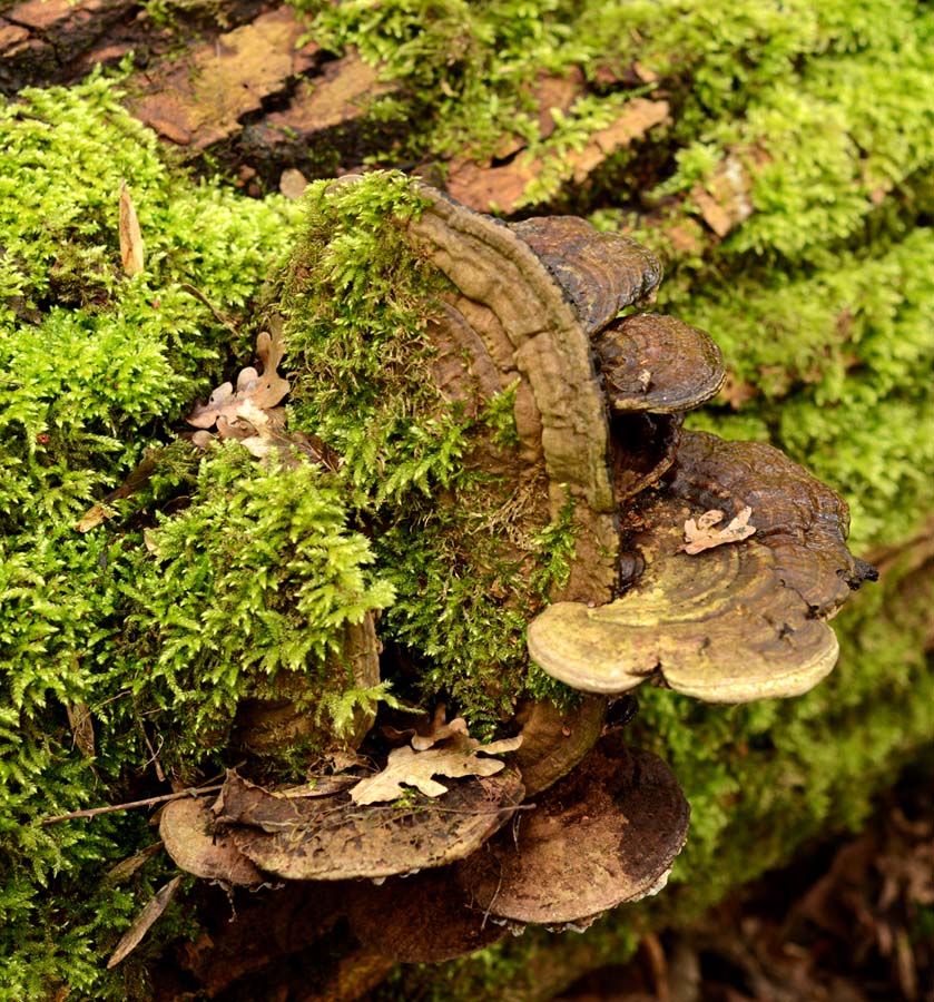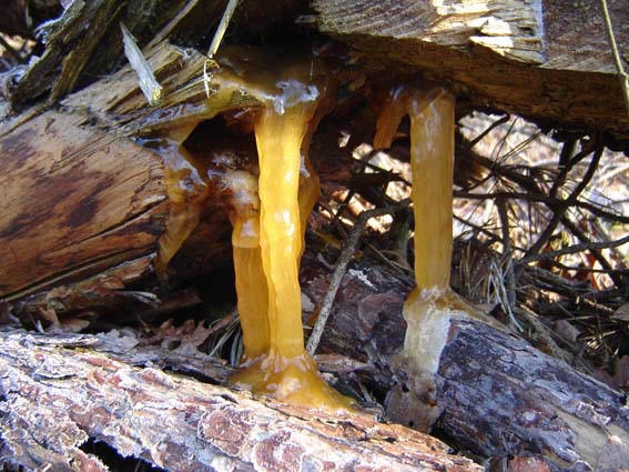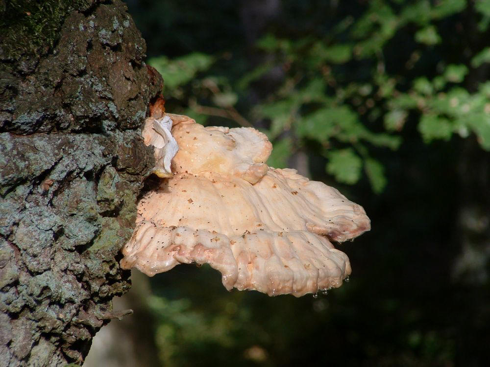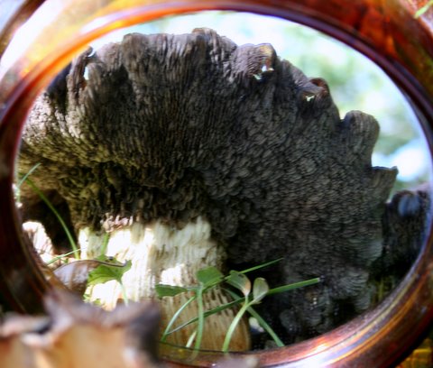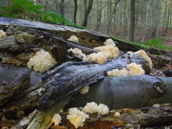 In de bossen nabij de ballonzuil trof ik deze merkwaardige dingetjes aan. Ze hangen aan de onderkant van een enorme dode boomstam van een es. Bij wrijven komt er een zwart poeder vrij.