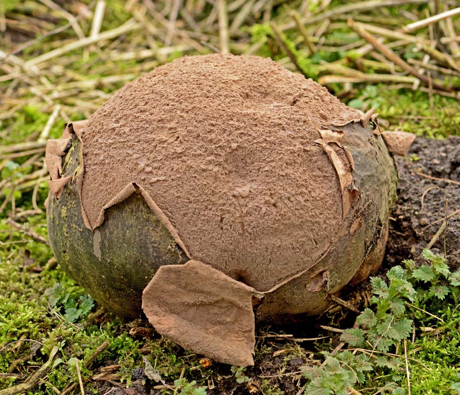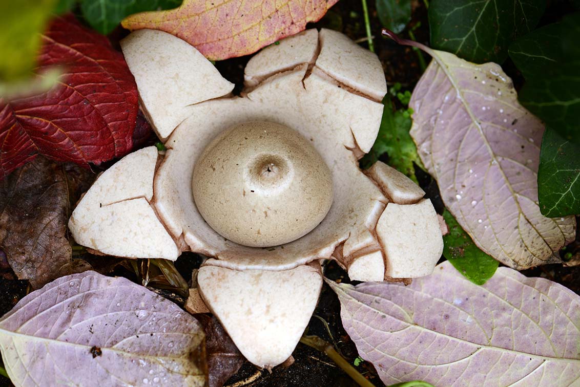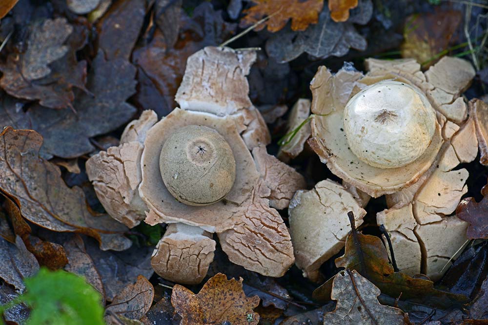 Eerder plaatste ik een foto van de gekraagde aardster (Geastrum triplex), gevonden in Venray centrum, deze week trof ik er drie (waarvan 2 op de foto) aan tussen en onder afgevallen blad op de Boshuizen.