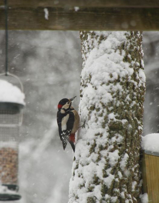 In onze tuin zien we regelmatig een grote bonte specht hangen, aan de krans met pinda`s in de dop. Hij (een mannetje met rood op de kop) hakt en tikt er lustig op los! In no time is de krans dan ook leeg en moet weer aangevuld worden.