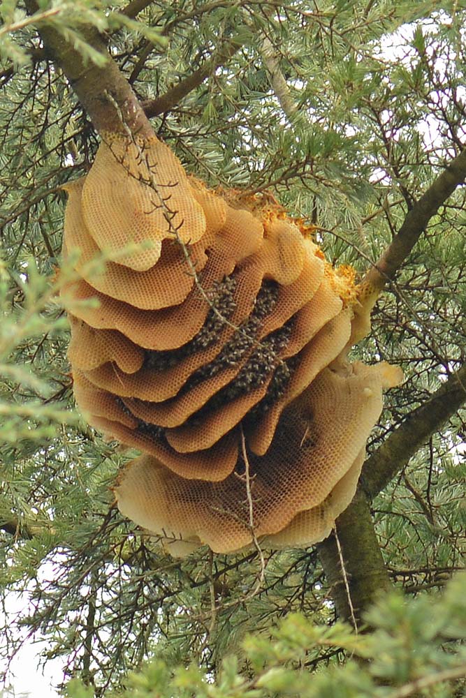 Vanmorgen (27 november 2016) deze foto gemaakt op st. Annaterrein te Venray. De bijen hebben een heel ratenhuis gebouwd in de open lucht op wel vijftien meter hoogte in een ceder atlantica. Het lijkt me onwaarschijnlijk dat die een winter kunnen overleven. Bij gebrek aan een telelens deze foto gemaakt met de macro.