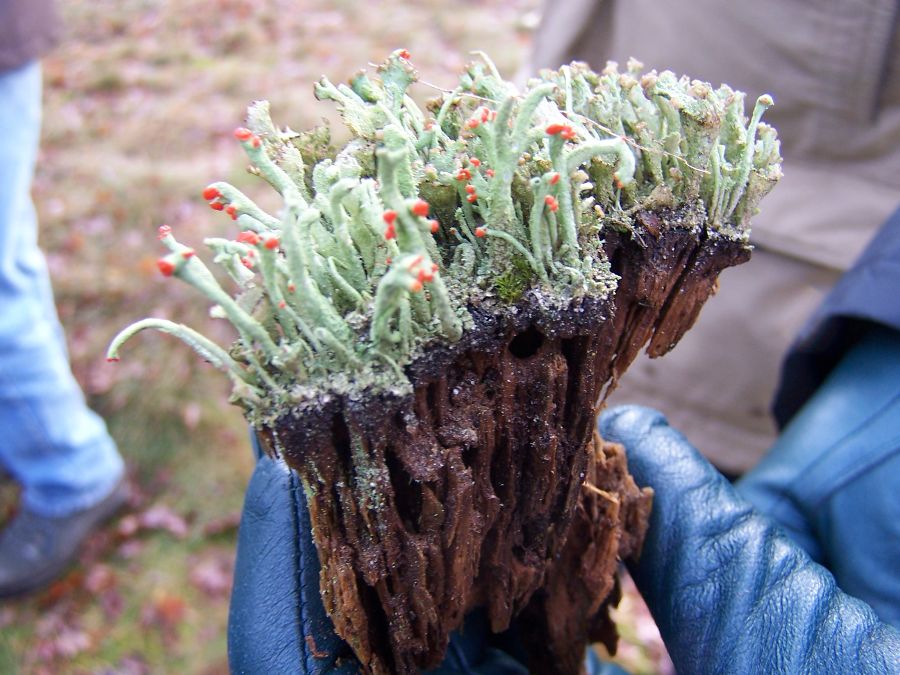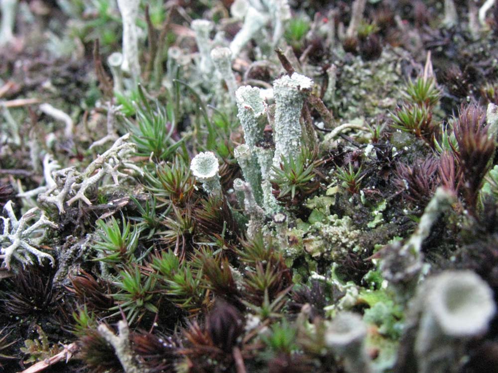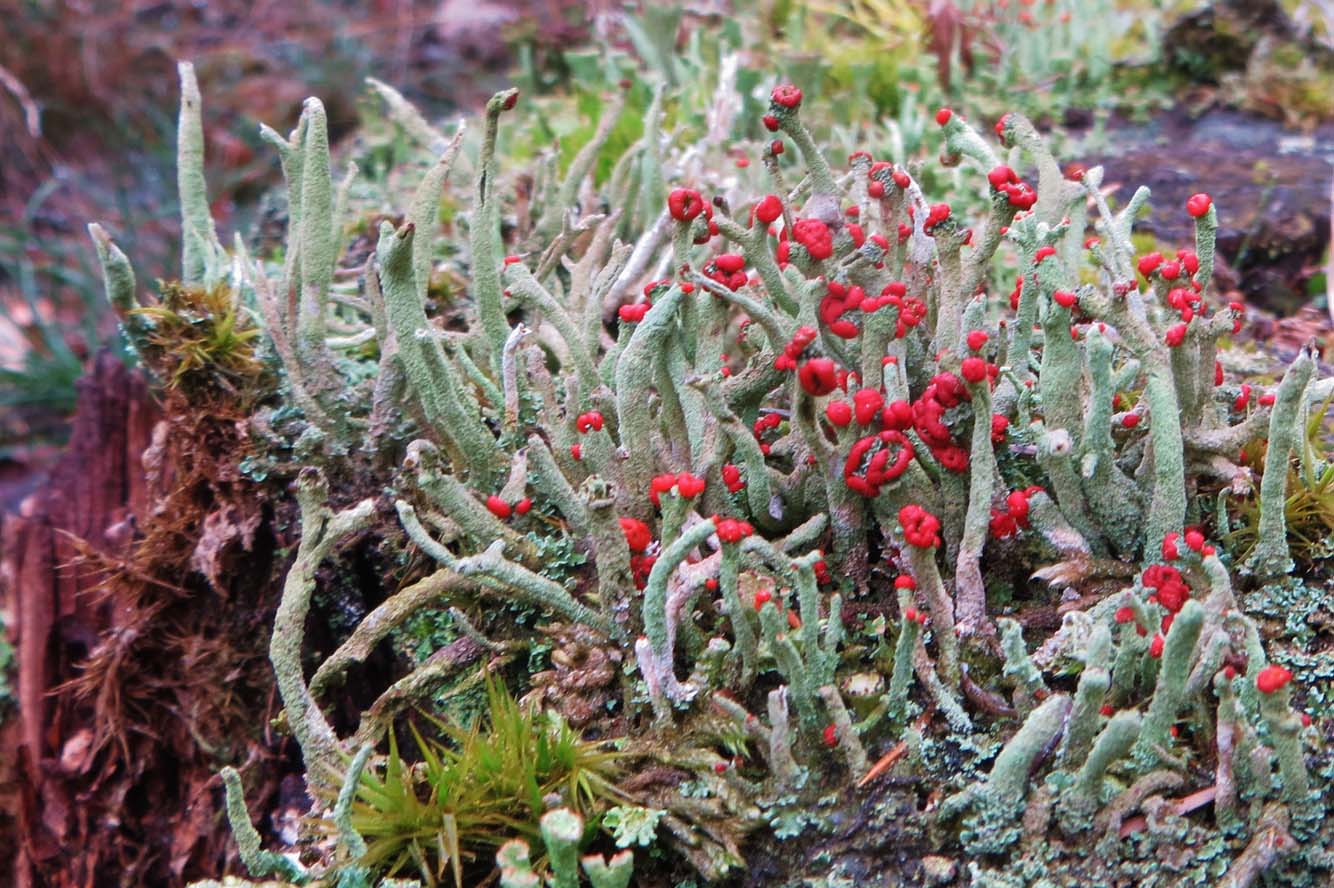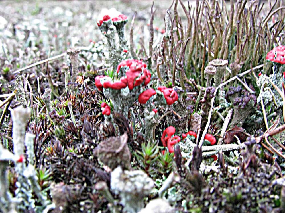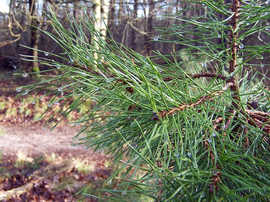 Ze zijn maar een paar millimeters in doorsnee en groeien op een dennenappel. Door de motregen hebben zich kleine druppeltjes op de hoedjes gezet en lijken die wel van glas. De naam heb ik zelf bedacht.
