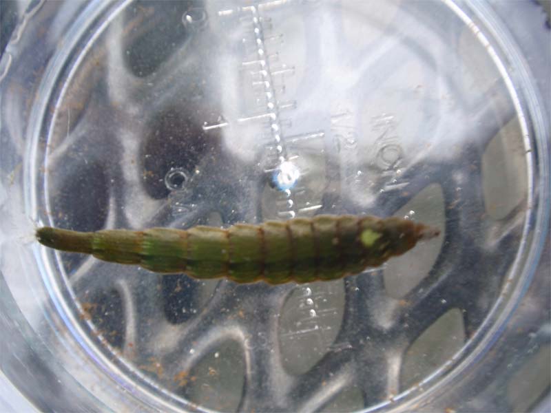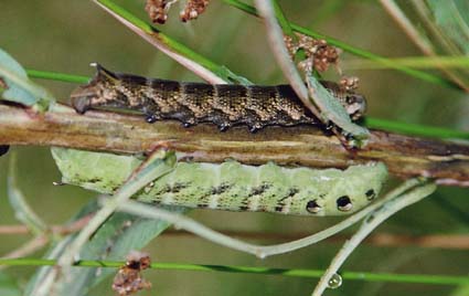 In het tijdschrift Vlinders van de vlinderstichting trof ik de zelfde foto aan met de volgende aanvullende tekst. Het groot avondrood (Deilephila elpenor) is in Nederland een algemene vlinder. Het is een prachtige gekleurde nachtvlinder uit de familie van de pijlstaarten en de vlinder vliegt vooral `s nachts in de maanden juni en juli. In de nazomer krijgen we bij De Vlinderstichting vaak veel telefoontjes van mensen die de rups in hun tuin hebben. De rupsen zitten op bijvoorbeeld wilgenroosje en teunisbloem, maar ook op tuinplanten zoals fuchsia `s, en komen voor in twee kleurvormen. Op de foto die we ontvingen van Anton van Zeeland is zowel de groene als de bruine vorm afgebeeld. De bruine vorm is overigens een stuk algemener dan de groene.