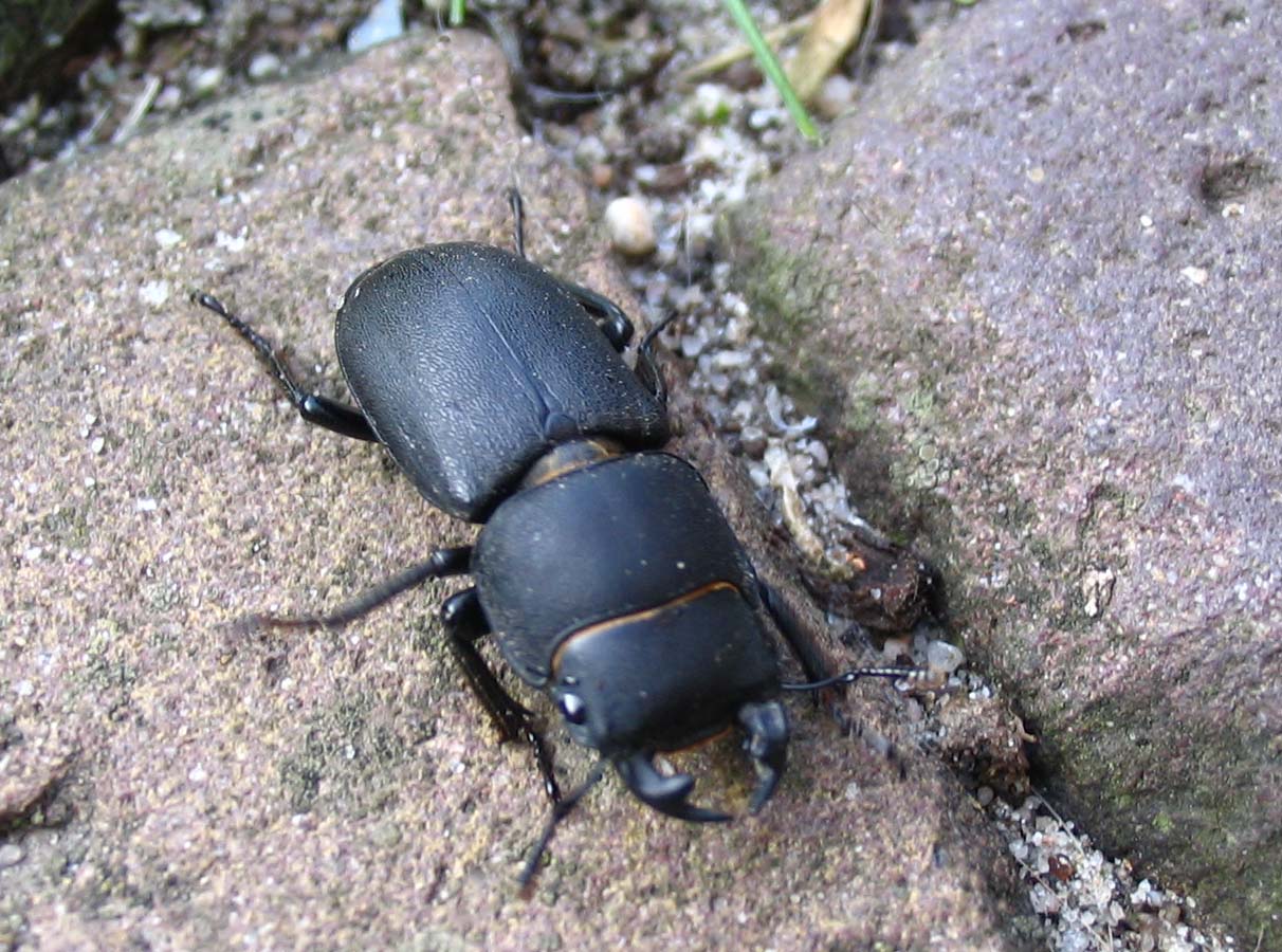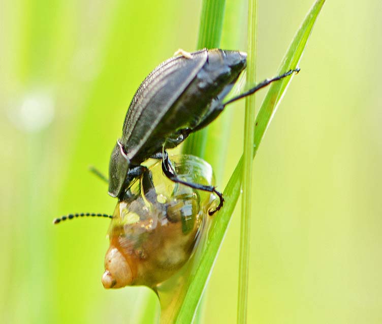 De slakkenaaskever Phosphuga atrata heeft een sterk versmalde kop en thorax waardoor hij diep in de huisjesslak kan binnendringen. Dit is dan ook zijn voorkeursprooi. Foto van 5 juli bij de visvijver aan de Wanssumseweg. >> Foto Slakkenaaskever