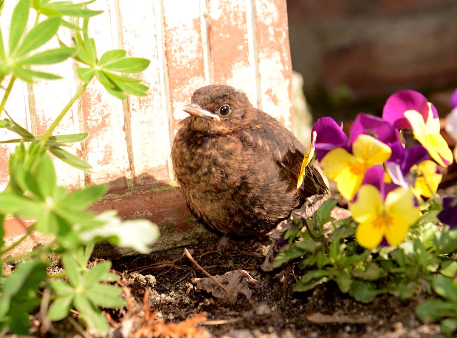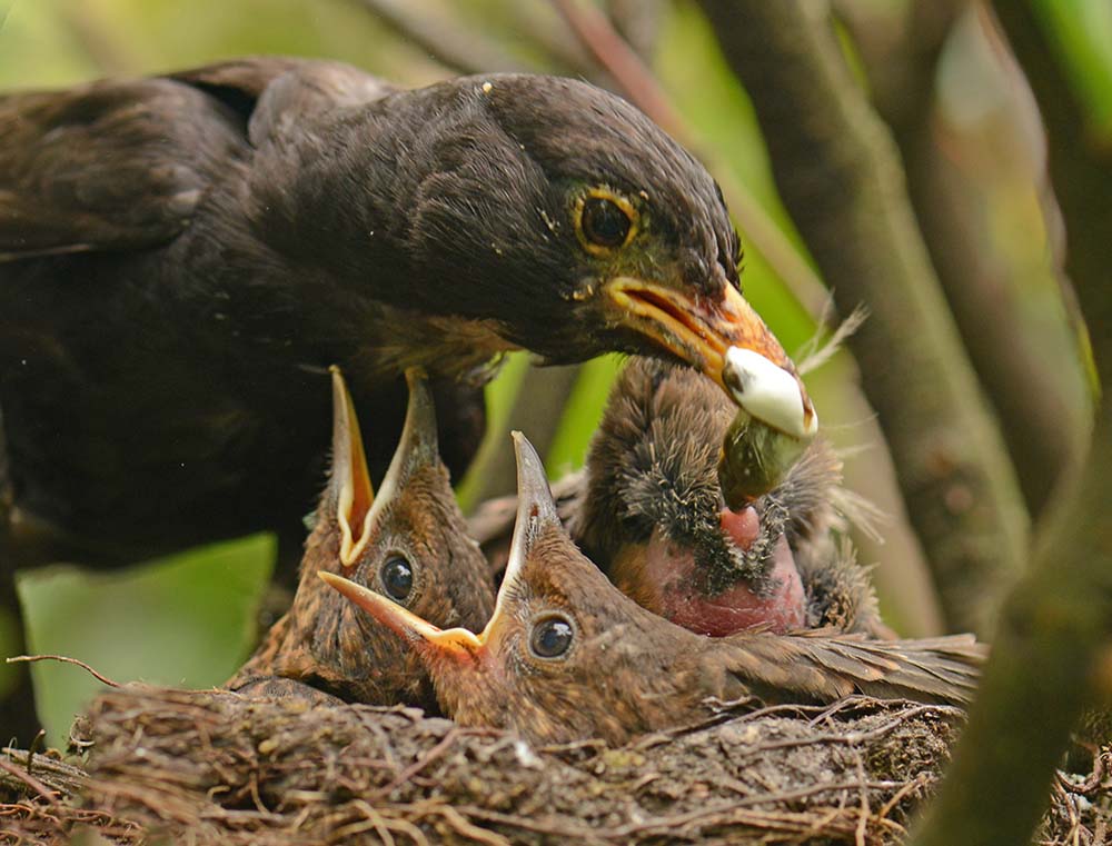 In juli maakte ik deze foto. Moeder merel heeft zojuist weer voedsel afgeleverd. Kop een beetje schuin wacht ze even af en plots steekt een jong vogeltje zijn gatje omhoog. Moeder trekt er de ontlasting uit en slikt het meteen naar binnen. Wetenschappers zouden dit een vorm van coprofagie noemen.