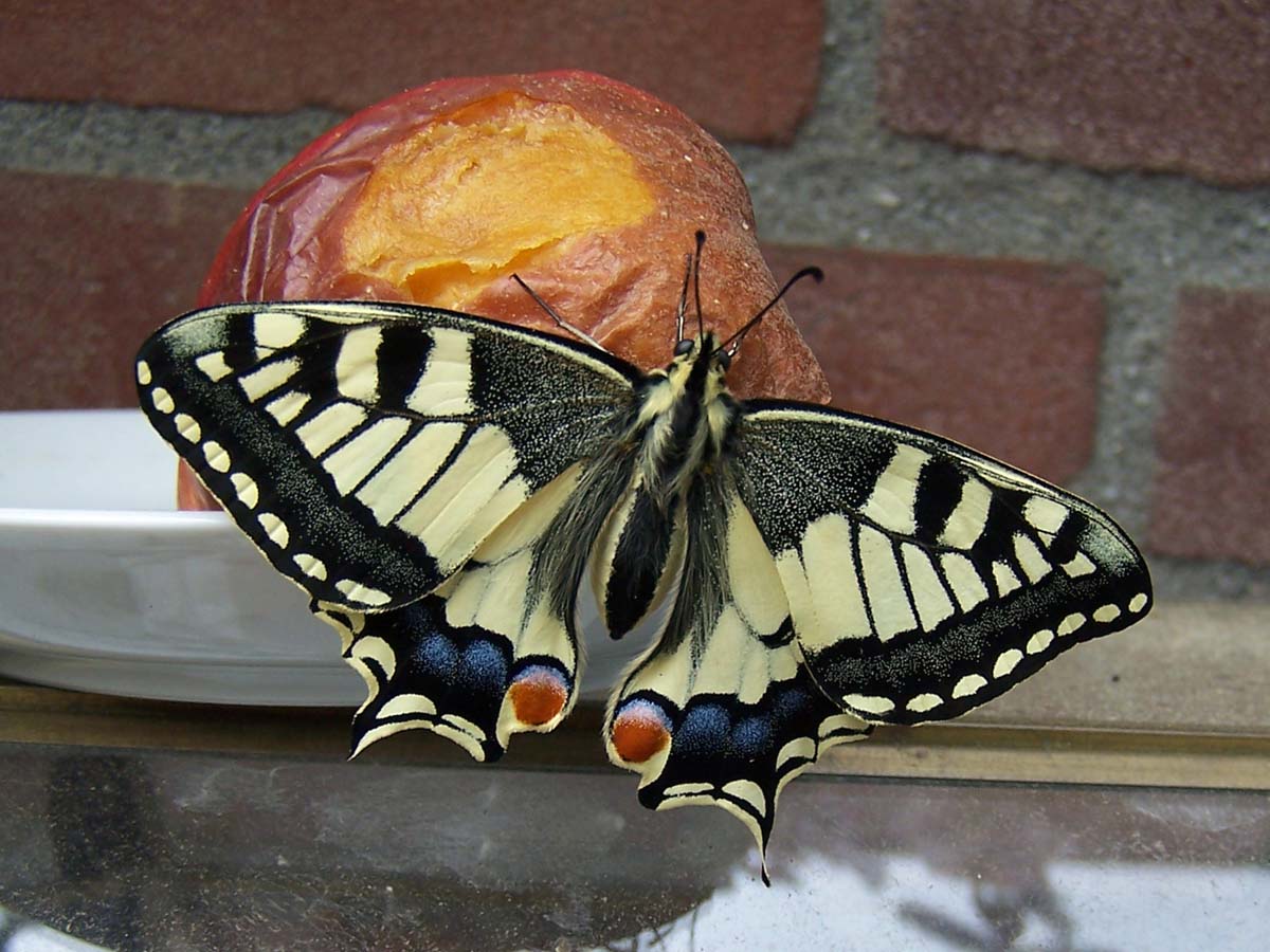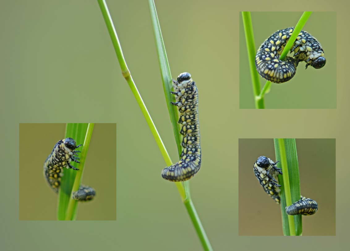 Twee kiekjes van de Koninginnepage en twee rupsen (Olifantsrups) van Groot Avondrood.gemaakt in de tuin van Anton van Zeeland.
