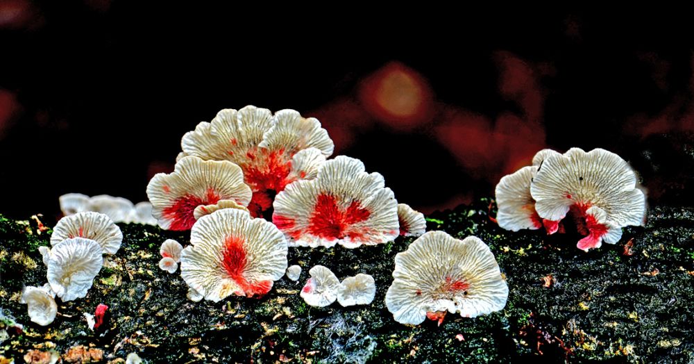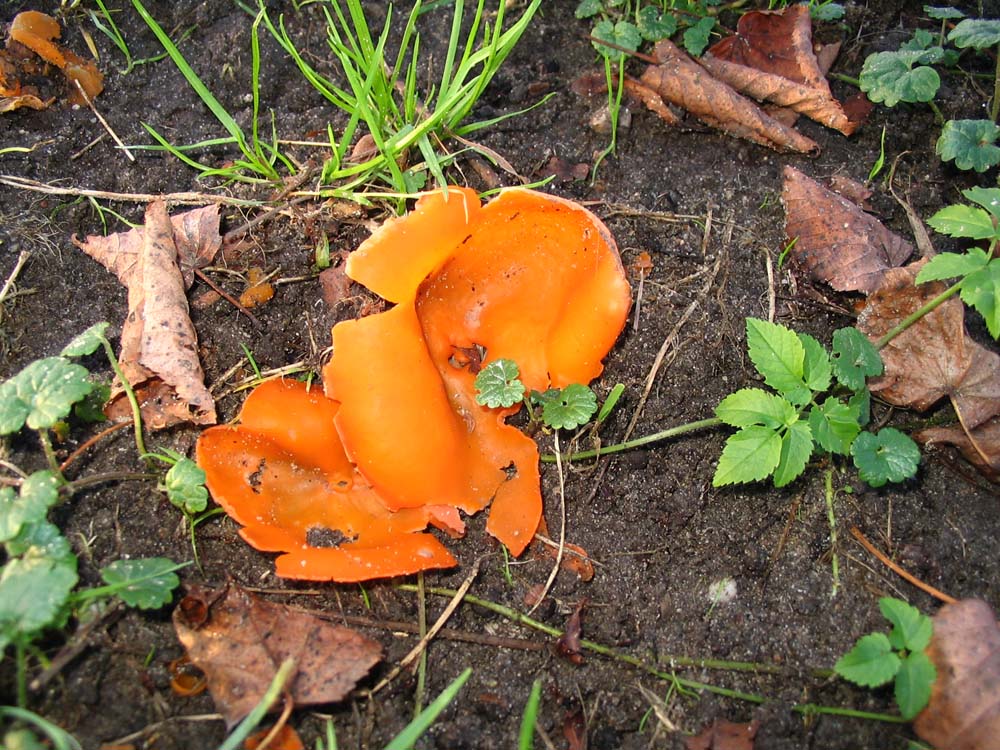 Twee foto’s die ik 24 oktober maakte van deze oranje mini paddenstoelen.