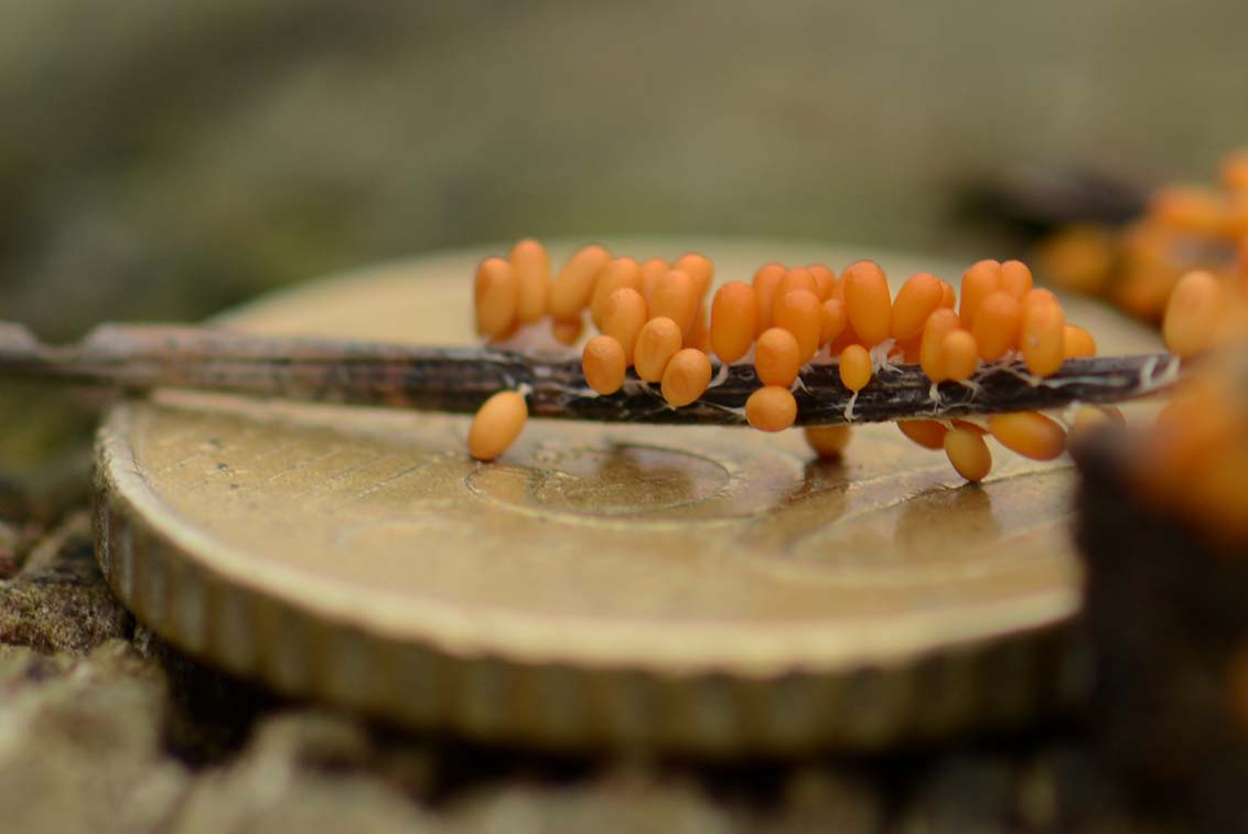 De naam van deze paddenstoel is draadwatje oftewel Trichia decipiens. Ze zaten dicht bij elkaar op houtsnippertjes en aan een dennennaald. Op de tweede foto heb ik er een 50 ct. munt onder geschoven, die een doorsnee heeft van 24 mm. De kleintjes hebben dus ongeveer een doorsnee van 1 mm.