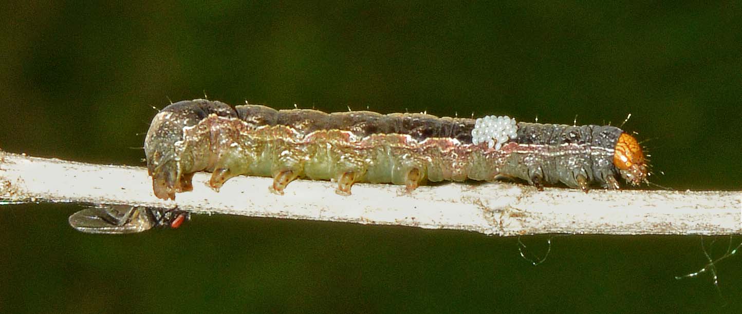 Op deze foto is een rups te zien van het oranje tipje op look zonder look, bij mij in de tuin.