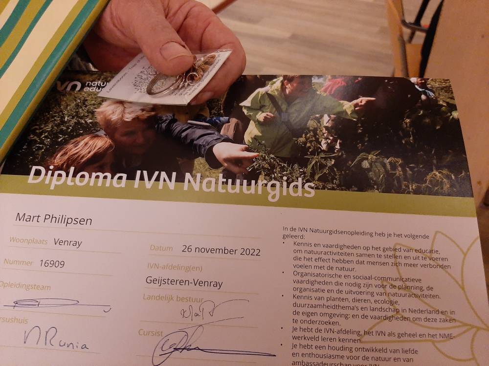Mart Philipsen als enige van zijn groepje, ondertussen gidsen coördinator en bestuurslid geworden bij het IVN, heeft met ondersteuning van Esther Swinkels, mentor, de draad weer opgepakt. Vandaag heeft Mart de gidsencursus succesvol met een verslag en presentatie van zijn onderzoeksgebied op de Buus afgerond.Mart, namens het bestuur van harte proficiat en dank aan Esther voor al die tijd dat zij de mentor was.