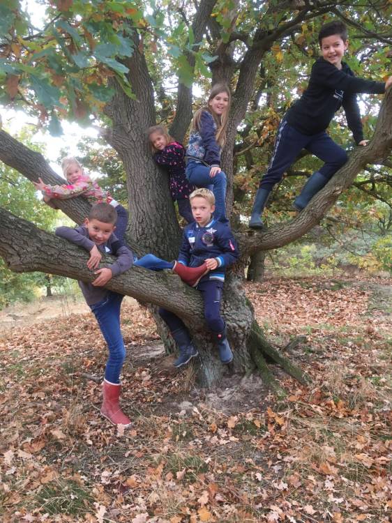 Vandaag waren we met veertig kinderen en verschillende met hun ouders, of opa of oma actief op het terrein van Vincent van Gogh. Hier is vijf jaar geleden een uitdagende belevingstuin aangelegd en op 9 oktober is het blote voeten pad geopend. Een van de gidsen, Mart Philipsen, heeft hier een natuur en quiz speurtocht utgezet. Ook hebben we opdrachten gedaan met het onderwerp bomen. zoals: de omarming van een 122 jarige beukenboom. Bomen hebben allemaal een ander jasje en hoe kun je zien hoe oud en hoog een boom is.