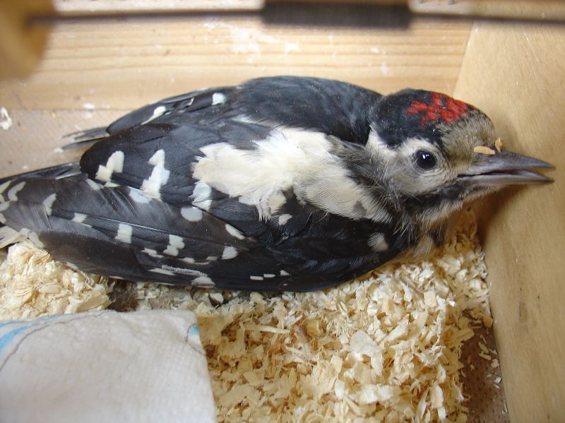Afgelopen zaterdag zag ik het, bij ons op terras een fladderende vogel, jawel de grote bonte specht. Afhankelijk dacht ik het is een volwassen specht en heeft iets gebroken, kan niet meer vliegen!. Probeerde op te pakken, hij krijste heel erg en huppelde weg. Uiteindelijk gelukt en in en vogelkooitje gelegd !!!!!!!
