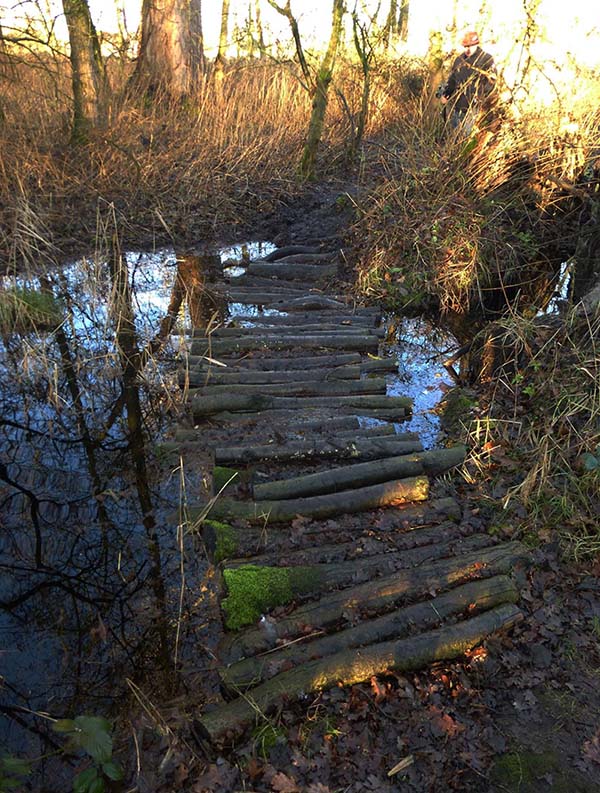 Het kan er in deze tijd van het jaar erg nat en moerassig zijn. Het pad leidt ons over oude houtwallen, veenbanen en langs de gereconstrueerde Lollebeek en het schaatsven.