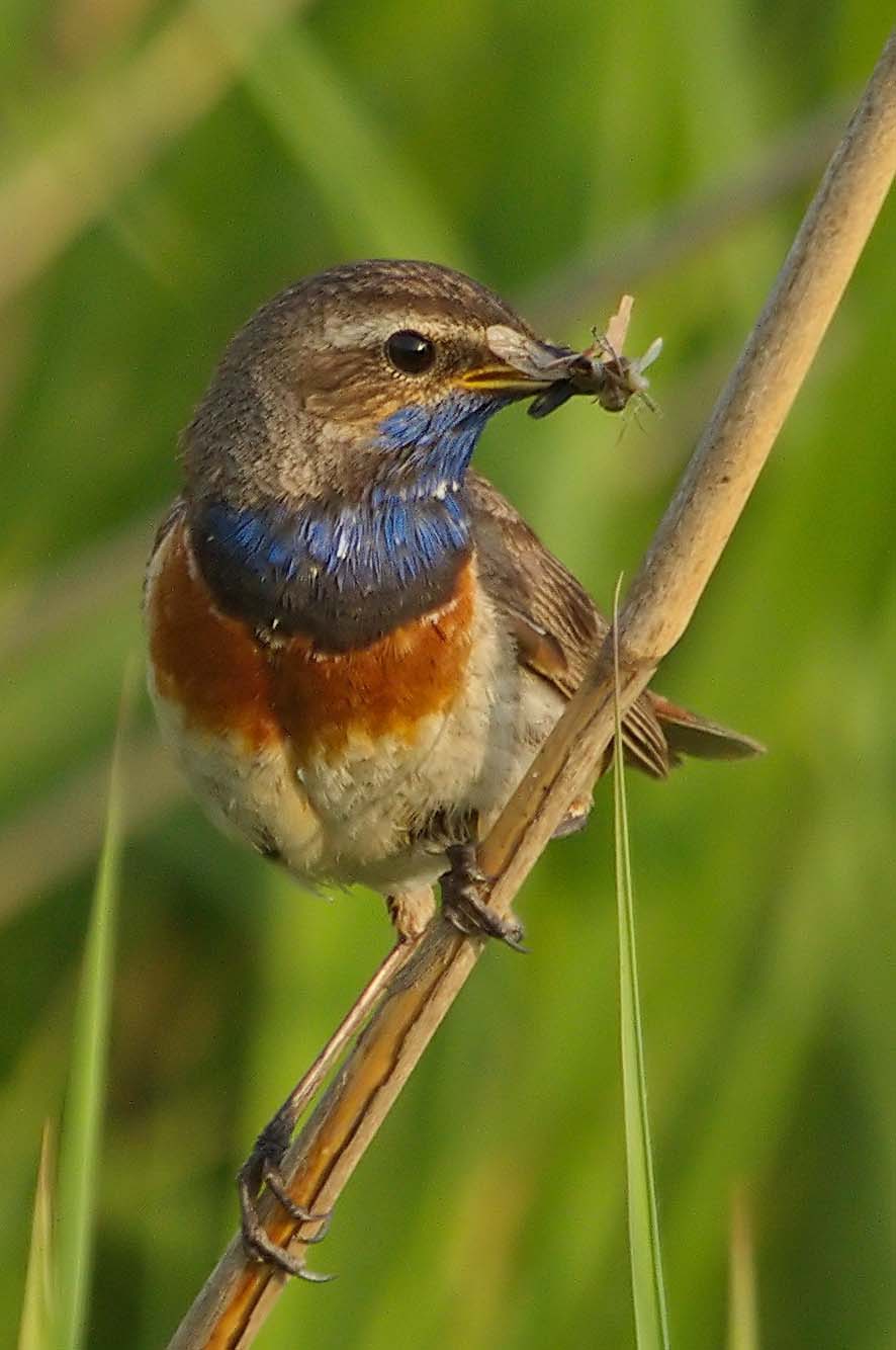 Niet veel mensen weten dat de blauwborst familie van de lijsters is. Eigenlijk verraden zijn opwaartse houding en korte loopjes over de drassige bodem dat de merel en zanglijster naaste verwanten zijn. Zo geheimzinnig als de vogel in de broedtijd is, zo opvallend is zijn baltsritueel in het vroege voorjaar. In maart zingt de blauwborst het liefst van een verhoging in het rietland en ruigte. Zijn blauwe borst met witte vlek opvallend vooruit.